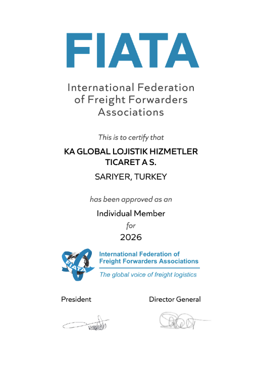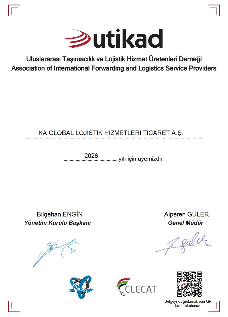 KA Global Lojistik Hizmetleri Ticaret A.Ş., Türkiye’de UTİKAD (Uluslararası Taşımacılık ve Lojistik Hizmet Üretenleri Derneği) ile uluslararası alanda FIATA (Fédération Internationale des Associations de Transitaires et Assimilés - Uluslararası Taşıma İşleri Komisyoncuları Federasyonu) üyesidir